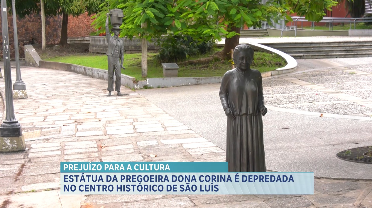 A estátua em homenagem à dona Corina, vendedora de pirulitos e figura representativa dos pregoeiros de São Luís, foi alvo de vandalismo no Centro Histórico. Localizada na Praça Nauro Machado, a obra teve o tabuleiro depredado, o que dificulta agora o reconhecimento do monumento por moradores e turistas. Inauguradas em 2022, as esculturas em tamanho real buscam preservar a memória de trabalhadores que, fazem parte da identidade cultural da capital maranhense.